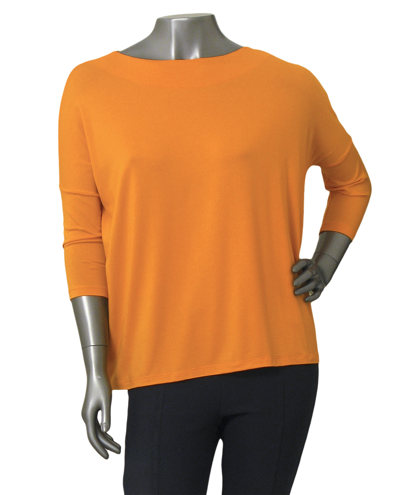 BLUSA COM MODELAGEM AMPLA, MANGAS 3/4 E DECOTE CANOA. EM MALHA DE VISCOSE 220g/m (96%VISCOSE4%ELASTANO).