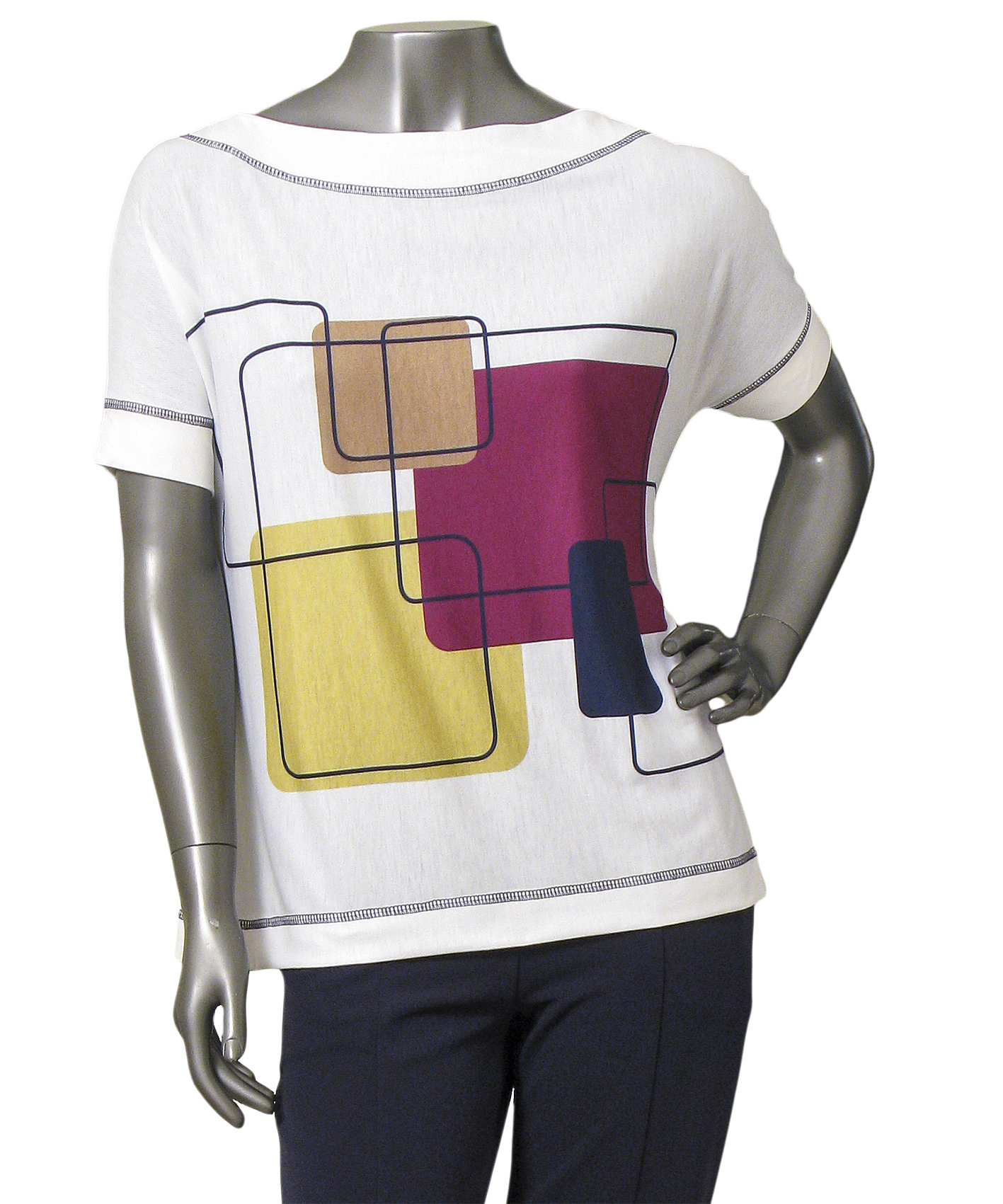 BLUSA COM MANGAS CURTAS E DECOTE CANOA. ESTAMPA LOCALIZADA EM SILK COM MOTIVOS GRÁFICOS E PESPONTOS DECORATIVOS NAS MANGAS, NA BARRA E NO DECOTE.