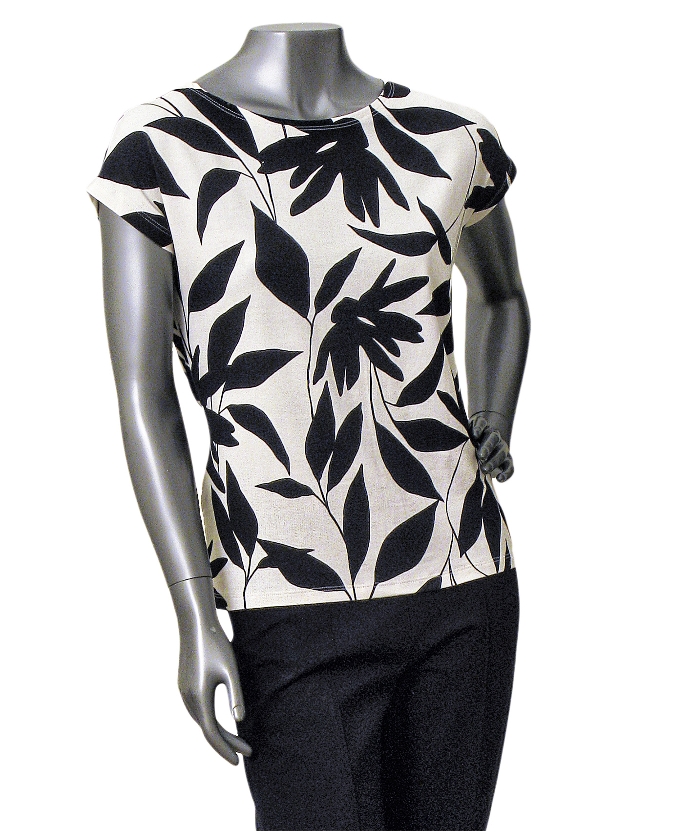 BLUSA SEM CAVAS COM ESTAMPA DIGITAL DE FOLHAS EM ESTILO DE SOMBRA CHINESA EM PRETO E FUNDO OFF WHITE COM TEXTURA DE TELA.