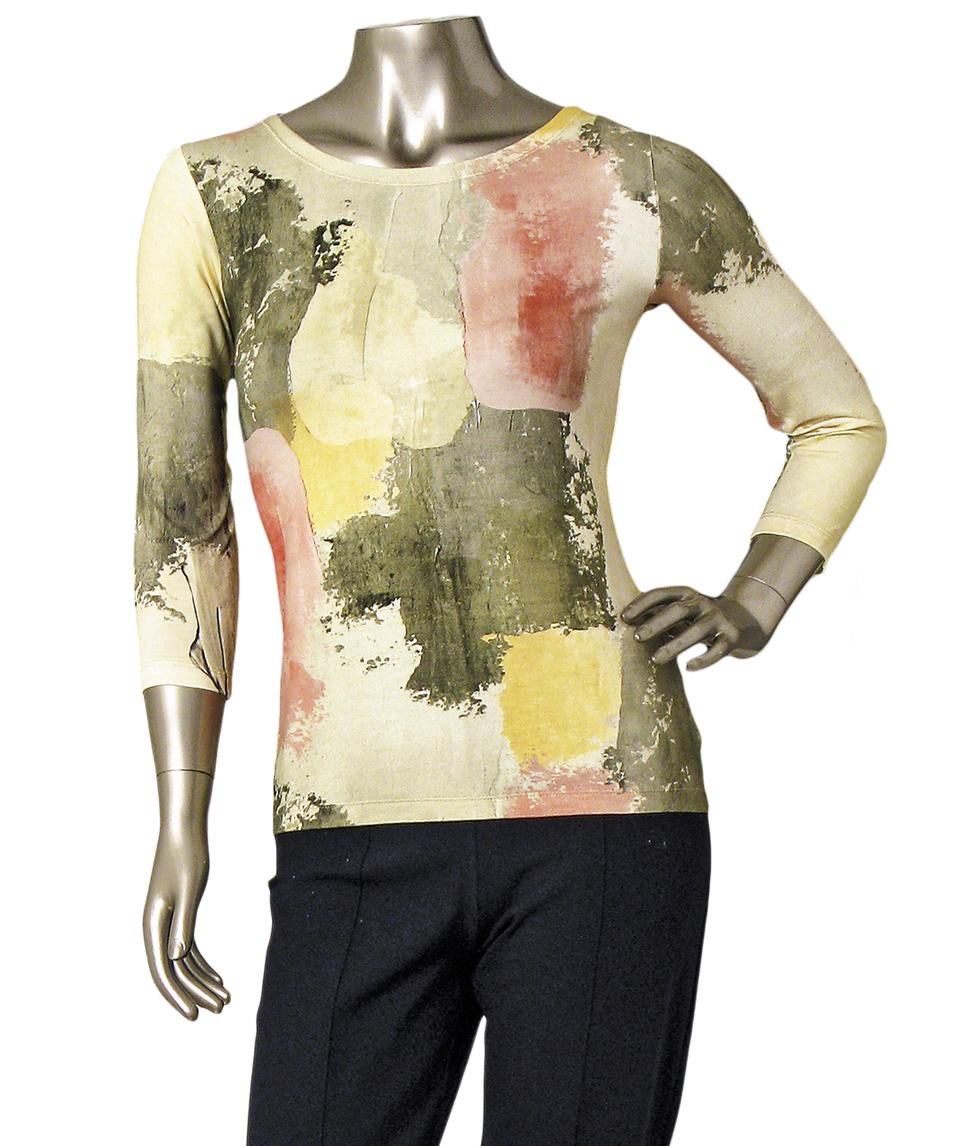 Blusa com mangas 3/4 e decote canoa em viscose com elastano. O destaque fica por conta da estampa abstrata em tons de aquarela, que traz um visual contemporâneo e leve, com formas abstratas que remetem a pinceladas.