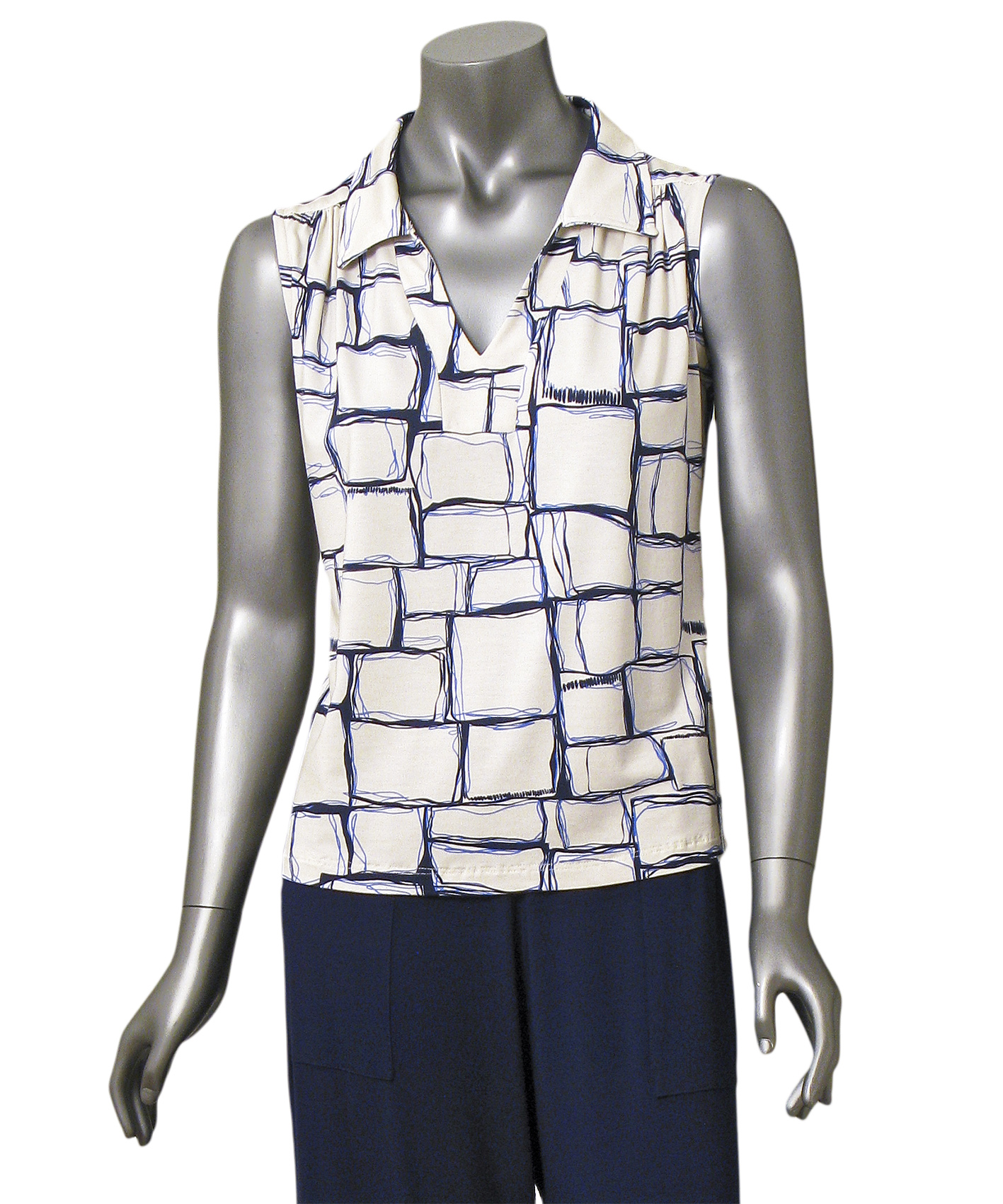 BLUSA SEM MANGAS COM GOLA POLO EM MALHA DE VISCOSE ESTAMPADA (96%VISCOSE 4%ELASTANO). RECORTES COM PREGAS NOS OMBROS E NAS COSTAS.