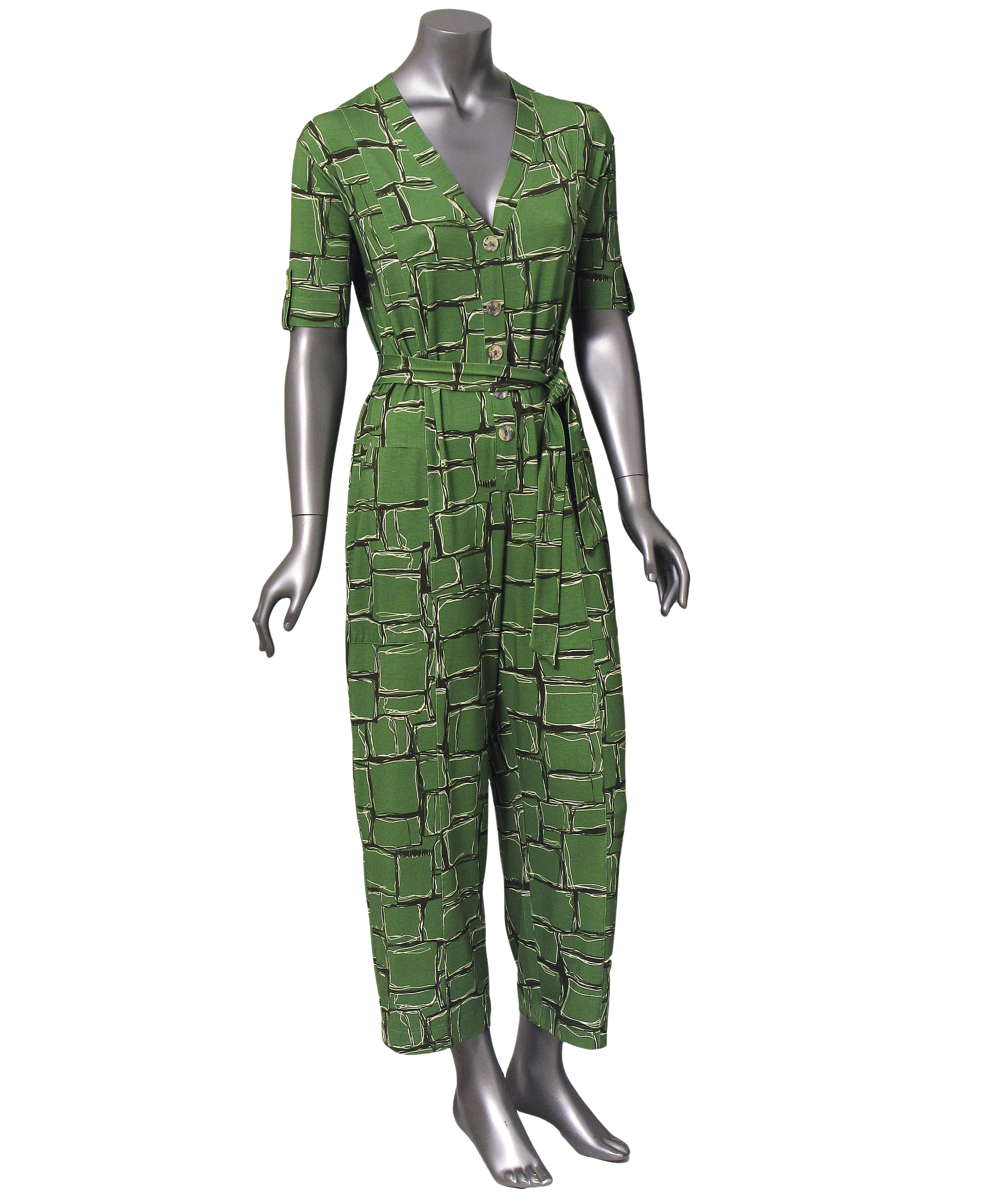 A estampa geométrica em preto e off white sobre fundo verde traz leveza e modernidade, ideal para o dia a dia elegante ou um compromisso casual chic. Uma peça única, prática e refinada — perfeita para mulheres que valorizam estilo e conforto.