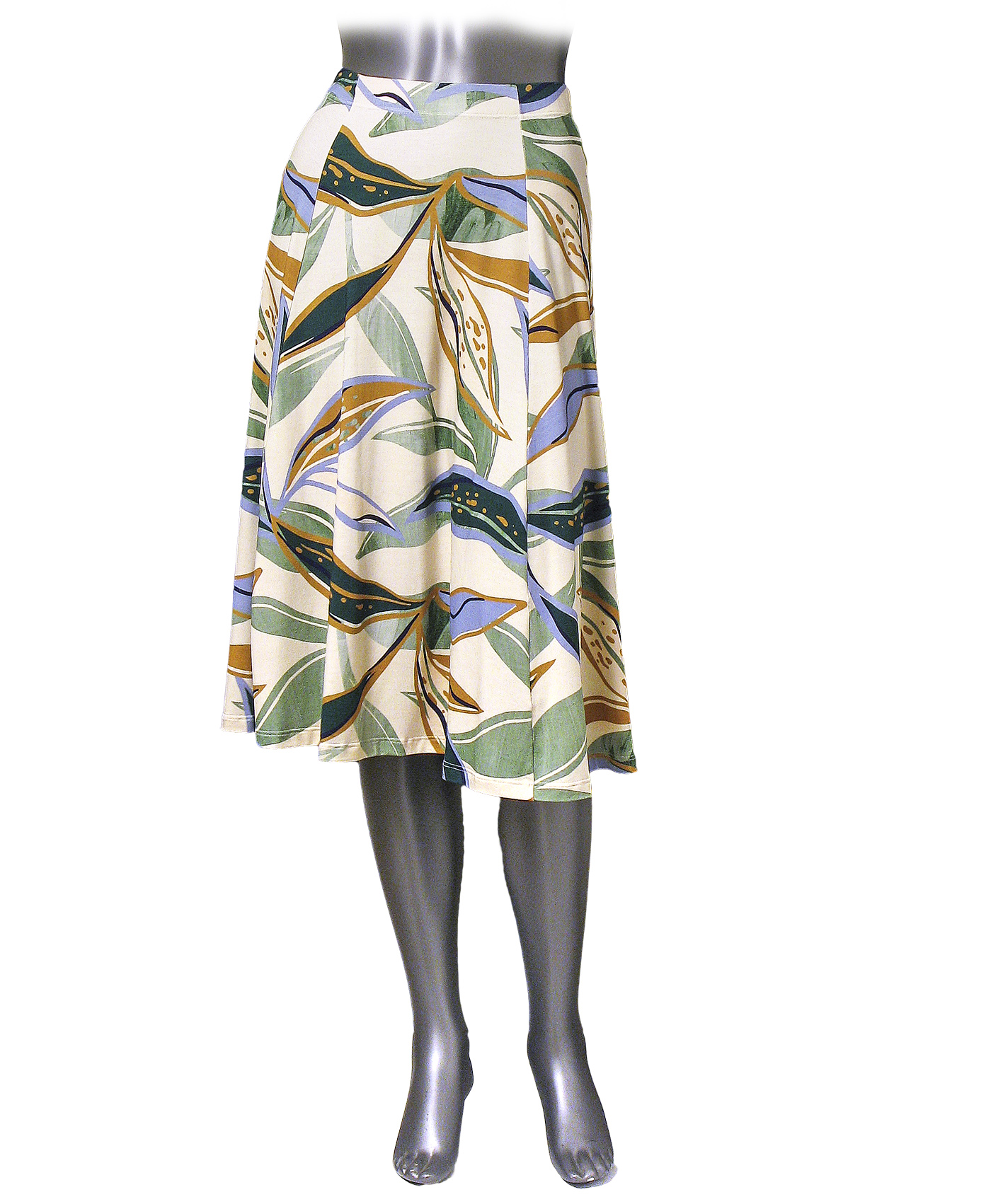 SAIA EM VISCOSE E ELASTANO (96%VISCOSE 4%ELASTANO) ESTAMPADA COM MOTIVO DE FOLHAS.