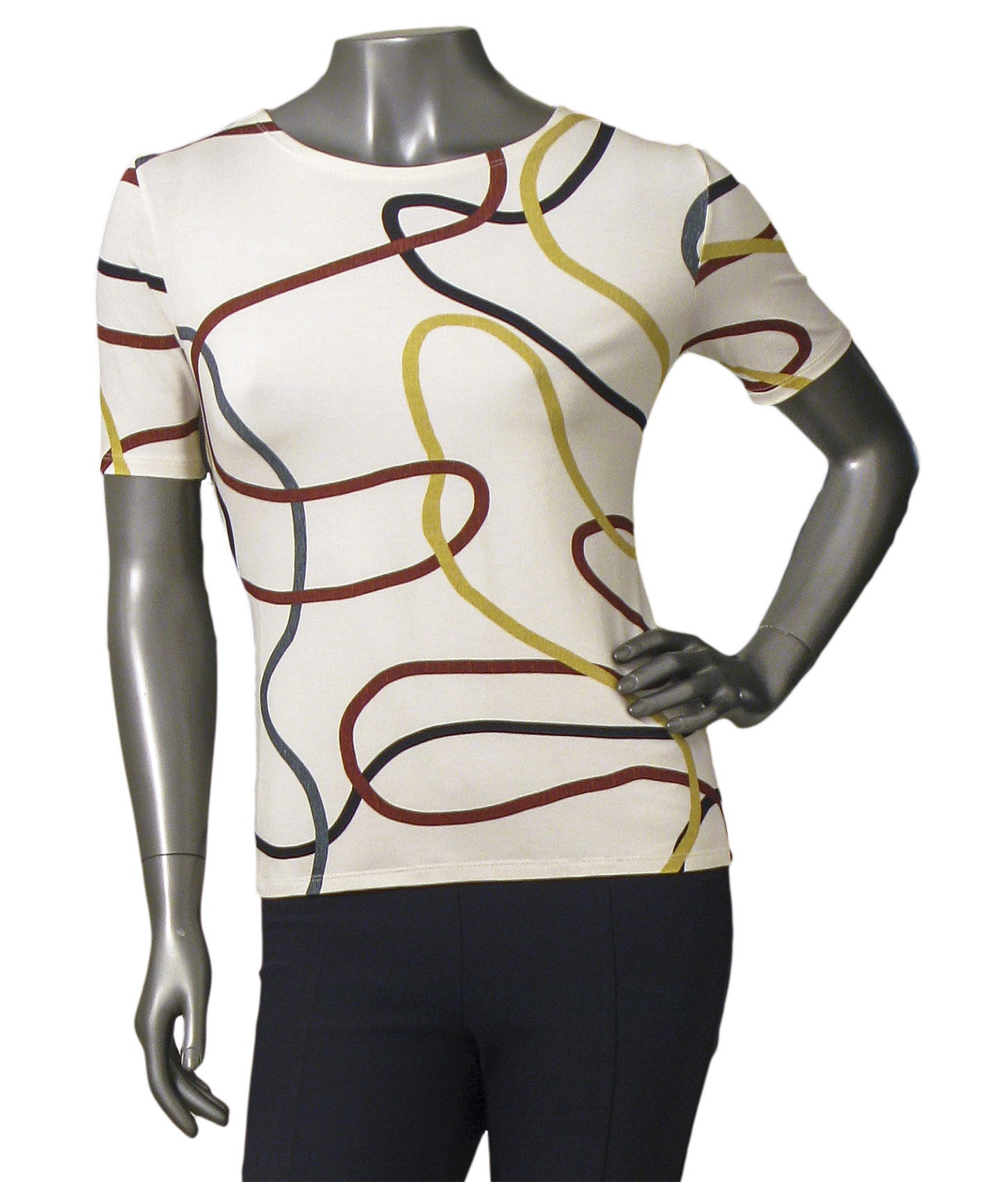 BLUSA T- SHIRT EM MALHA DE VISCOSE (96%viscose 4%elastano) COM ESTAMPA DIGITAL COM MOTIVO GRÁFICO.